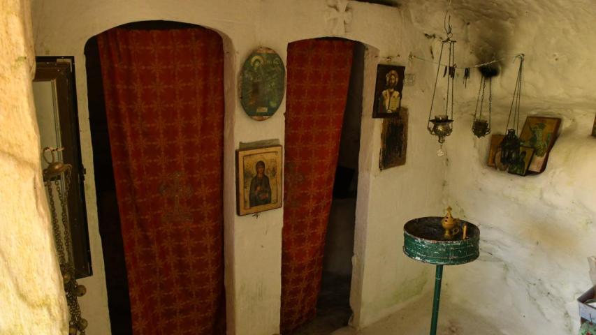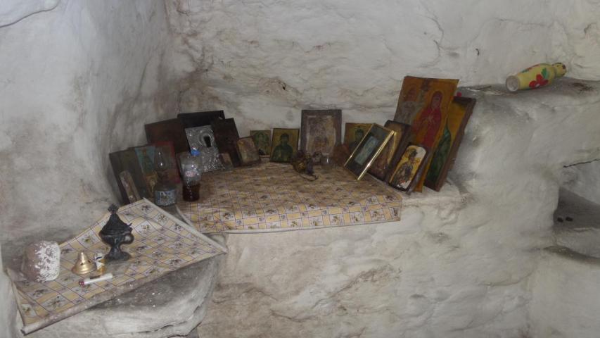 In the location of Tenediontis, on the northern foothills of Agios Minas hill among oaks, stands the chapel of Agia Paraskevi. This little church stands out for its unusual form, being carved into the natural rock, with only the east façade — where the entrance is — built in stone. From there one enters a rectangular chamber divided by a stone templon into the nave and sanctuary. On the left of the sanctuary, a niche serves as the Holy Table, while another in the north wall, with a drainage channel, functioned as a sacrarium. Lamps and small icons are found in the space, of no special artistic value. The use of caves for worship is common on islands, where sacred items and treasures were often protected during times of piracy. Its proximity to an open-air shrine strengthens the likelihood of early cultic use of the area, perhaps even funerary, proving the site’s enduring religious significance.