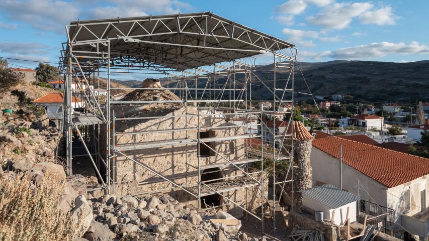 L’église post-byzantine Saint-Basile domine le centre de l’ancien village ruiné d’Agios Efstratios et est l’un des monuments les plus anciens conservés de l’île, classé depuis 2000. Construite en 1727 en pierre locale, comme l’indique l’inscription encastrée sur la façade ouest, c’est une église de type croix inscrite compact avec coupole, sans abside au sanctuaire, toiture à deux versants en schiste et dôme couvert de tuiles. Elle possède deux entrées, à l’ouest et au sud, et, à l’intérieur, une nef unique avec narthex intérieur. Son iconostase en bois sculpté, sobre mais importante, date de sa construction et abrite de remarquables icônes, dont celles de la Théotokos, du Christ et de saint Basile. Les fouilles ont livré céramiques et objets liturgiques, monnaies de bronze et jarres acoustiques scellées dans les murs. Les découvertes vont du XVIIIe au XXe siècle, éclairant l’histoire et l’usage du monument.