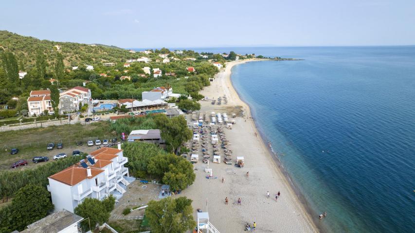 Plomari yerleşiminin güneydoğusunda, yaklaşık 2,5 km mesafede Ayios Isidoros Plajı bulunur. Adını bölgedeki aynı adlı küçük şapelinden alır. Plajın kıyı şeridi ve deniz tabanı çakıl ile kaplıdır; özellikle uç kısımlarda kayalık çıkıntılar görülür. Orta bölüm organize olup soyunma kabinleri, şemsiyeler, şezlonglar, duşlar, çöp kovaları ve kutuları bulunur. Bu bölümde ayrıca bir plaj voleybolu sahası ve cankurtaran istasyonu vardır. Kıyıya yakın bölgede kiralık odalar, restoranlar, büfeler, bir futbol sahası ve terk edilmiş bir sanayi tesisi bulunur. Doğrudan çevrede, turistik etkinlik ile tarımın bir arada görüldüğü Agiou Isidorou yerleşiminin kentsel dokusu hâkimdir. Tarif edilmesi güç güzelliği ve kristal berraklığındaki suları, özellikle yaz aylarında kalabalıklar çeker.