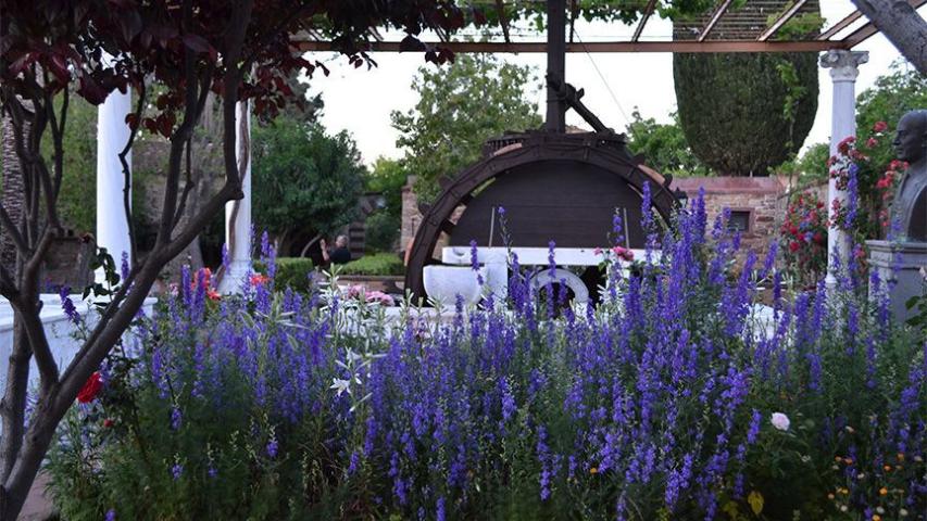 Sakız kentinin 6 km güneyindeki Kambos, doğa ile mimarinin uyum içinde var olduğu adanın en karakteristik ve aristokratik yerleşimlerinden biridir. 14. yüzyıldan itibaren yerli ve Cenevizli ailelerin inşa ettiği görkemli konaklar ve mis gibi narenciye bahçeleriyle bilinir; geleneksel yerleşim ve tarihî alan olarak korunur. Thymiana taşından yüksek duvarlar her mülkü çevreleyerek renkli bahçeleri ve kemerli kapılı, mermer konsollu, çakıl mozaikli avlulu taş evleri korur. Bugün birçok konak ziyarete açıktır; kokular ve tarihle dolu bir manzara içinde başka bir dönemin atmosferine benzersiz bir gezinti sunar. Kambos, doğal güzelliği ve eşsiz mimarisiyle Sakız kültürünün yaşayan bir müzesi ve yürüyüş/keşif için sevilen bir duraktır.