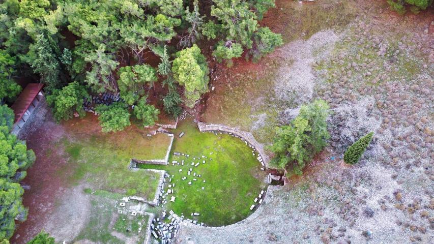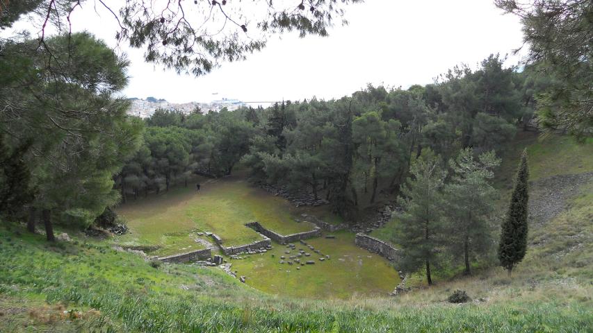 Helenistik tiyatro (MÖ 2. yy), kentin en yüksek noktasında, muhtemelen antikçağda bir koruluğun bulunduğu iç surların yanında inşa edilmiştir. Plutarkhos’un Pompeius’un Yaşamı’na göre, İtalya’daki kalıcı taş tiyatroların yapımında örnek alınmış, antik dünyanın en önemli tiyatrolarından biri sayılır. Mimari olarak seyirci oturma yeri (koilon), koro ve Dionysos kültü için dairesel orkestra, giriş geçitleri, proskenion ve altı dor, üstü iyon düzeninde iki katlı zengin bir sahne yapısından oluşur. Tümü mermerdendir. At nalı biçimli koilonun kapasitesi yaklaşık 18.000 seyircidir. MS 2. yy ortalarında, sahnelenen şiddetli gösterilerde alt sıralardaki seyircileri korumak için orkestrayı çevreleyen yüksek bir istinat duvarı inşa edilmiştir; böylece tiyatro bir arenaya dönüşmüştür.